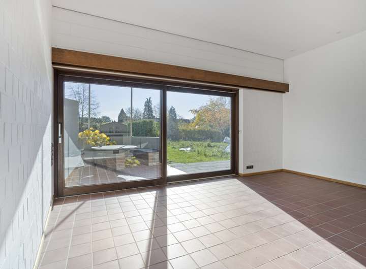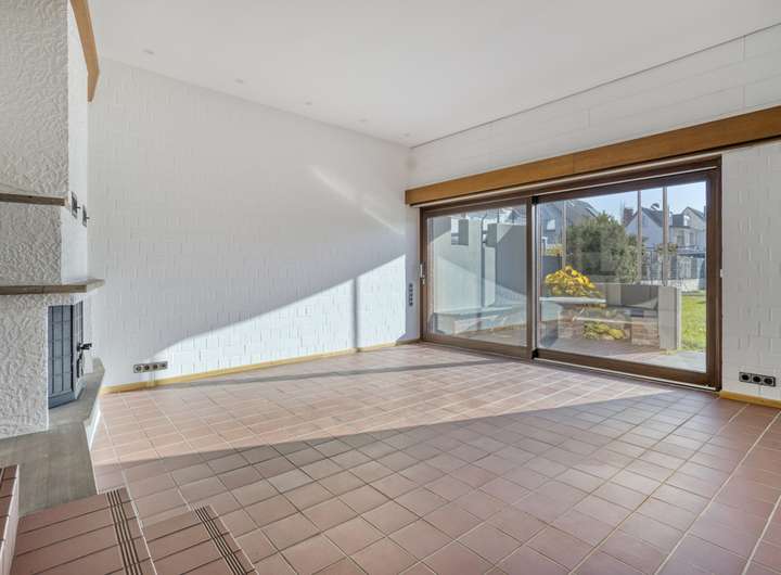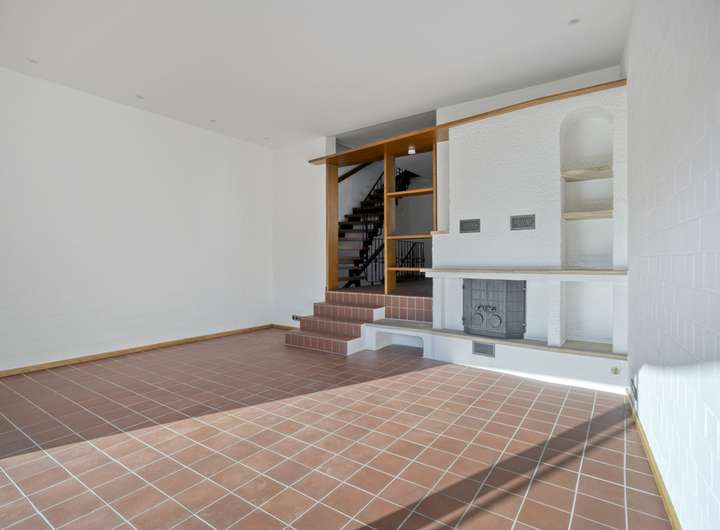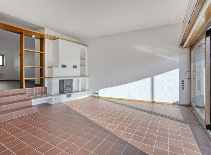 Großzügiges Wohnzimmer mit Kamin und Zugang zur ca. 25 m² großen Terrasse und dem Garten. Split-Level zum Esszimmer (ca. 8 m²), offene Küche, Diele mit Garderobe sowie ein Gäste-WC.