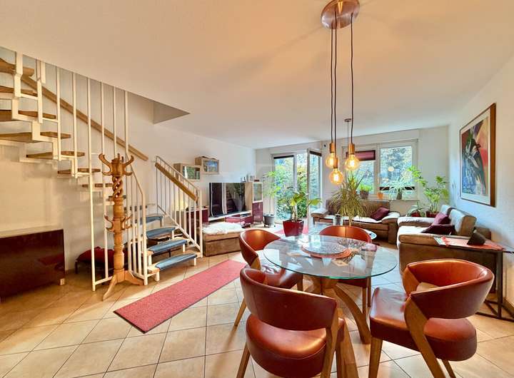 Schon beim Betreten spürt man das harmonische Wohngefühl: Das gepflegte, geflieste Erdgeschoss empfängt Sie mit einem offenen Grundriss und viel Tageslicht. Im Wohn- und Essbereich sorgen große Fensterfronten für ein freundliches Ambiente und bieten Zugang zur ca. 12 m² großen Terrasse, die zum Verweilen und Entspannen einlädt – ob beim Frühstück in der Morgensonne oder beim abendlichen Grillen mit Freunden.