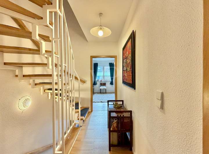 Über eine harmonisch integrierte Treppe gelangen Sie ins lichtdurchflutete Obergeschoss, das nachträglich mit feinem Parkett ausgestattet wurde. Zwei großzügige Zimmer bieten vielfältige Nutzungsmöglichkeiten – eines davon mit praktischer Ankleide. Das ebenfalls modernisierte Duschbad präsentiert sich elegant und funktional zugleich und verwöhnt mit einem Aquaclean-WC (Bidet- und WC-Funktion). Weitere Annehmlichkeiten sind die Unterbringung von Waschmaschine und Trockner.