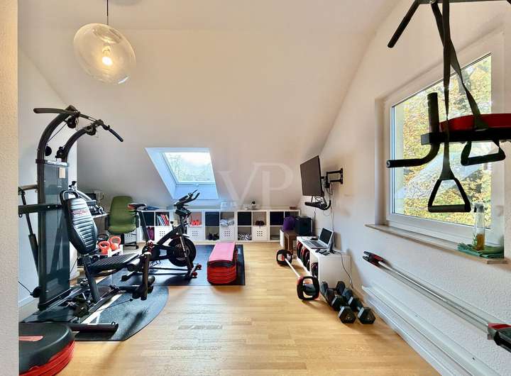 Das ausgebaute Dachgeschoss bildet das Highlight des Hauses: ein heller, offener Raum mit hochwertigem Parkettboden – ideal als Studio, Gästezimmer oder Rückzugsort für kreative Stunden.