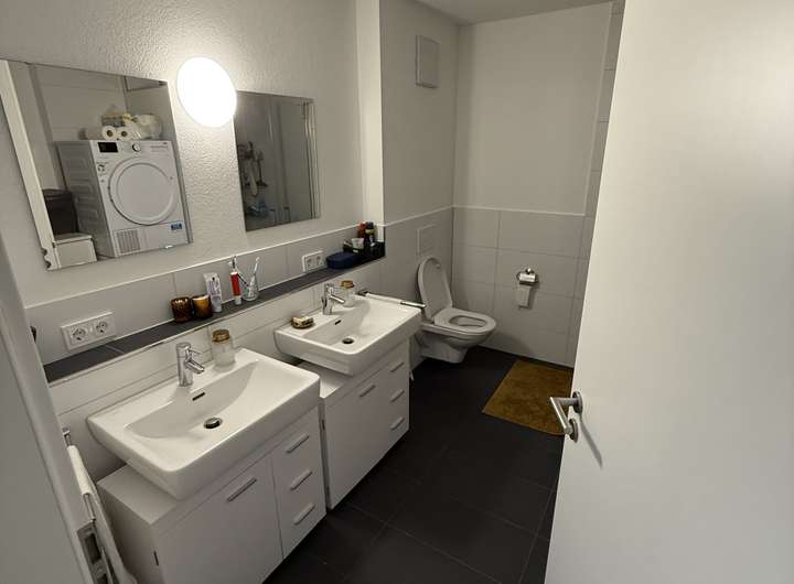 Ein modernes Badezimmer mit ebenerdiger Dusche, Anschluss für Waschmaschine und Trockner, sowie ein separates WC runden das Raumangebot ab. Ein praktischer Abstellraum innerhalb der Wohnung und ein separater Kellerraum bieten zusätzlichen Stauraum.
