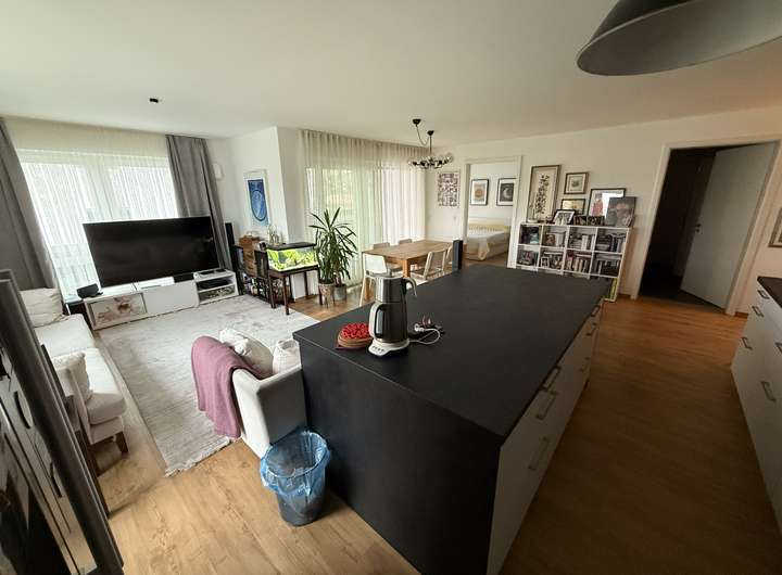 Der großzügige Wohn-, Ess- und Kochbereich mit rund 46,65 m² bildet das Herzstück der Wohnung. Die großen Fensterflächen sorgen für lichtdurchflutete Räume und schaffen eine freundliche, offene Atmosphäre. Von hier aus gelangen Sie direkt auf die sonnige Terrasse mit Grünanteil, die zum Entspannen im Freien einlädt.