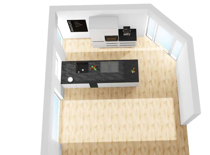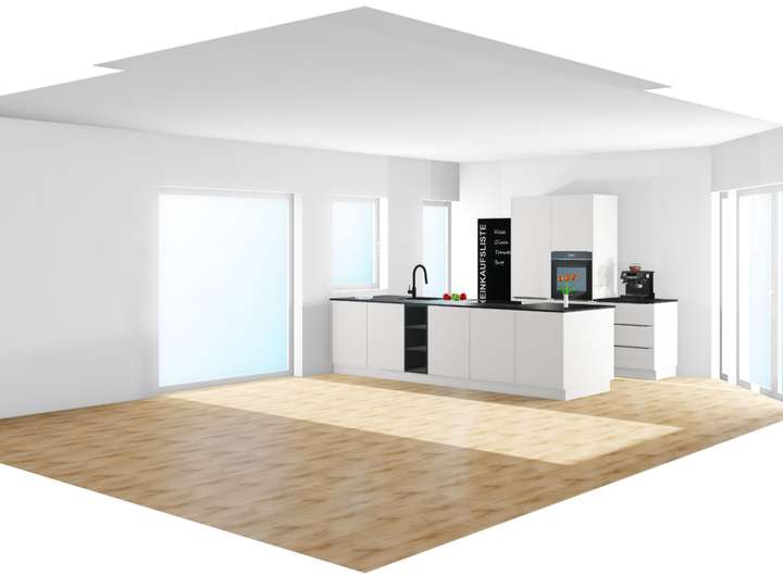 Die Einbauküche mit edler Natursteinplatte und hochwertiger Technik von Bora, Neff und Co. wird Anfang Dezember installiert. Des Weiteren wird zum Jahreswechsel noch eine hochwertige Lofttür zwischen Diele und Wohnküche für ein großzügiges Raumgefühl installiert.