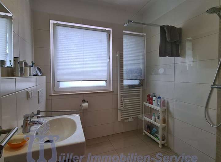 Bad und Gäste-WC mit Tageslicht verfügen über eine hochwertige Badezimmerausstattung mit weißen Sanitärobjekten und cremefarbenen Wandfliesen 30 x 60 cm; das Hauptad ist zusätzlich mit einem Handtuchheizkörper ausgestattet.