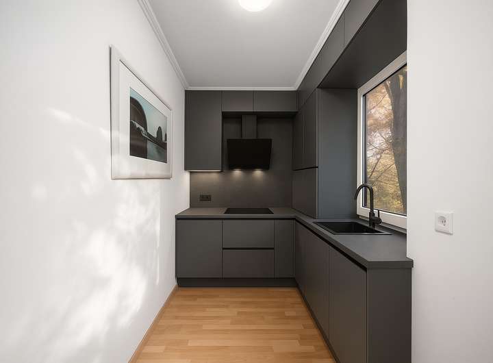 Die separate Küche aus dem Jahr 2025 ist in modernem Anthrazit gehalten und ist vollständig ausgestattet mit: