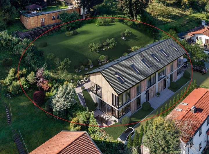 Der Vorbescheid für den Bau eines großzügigen Doppelhauses liegt bereits vor. Die beiden Parzellen umfassen ca. 643 m² und 621 m². Der Gesamterwerb des Grundstücks ist ebenfalls noch möglich.