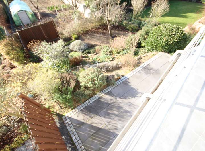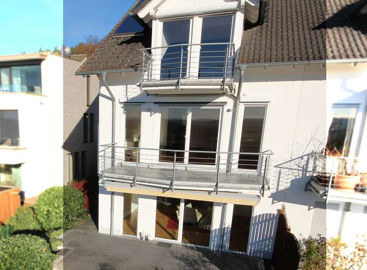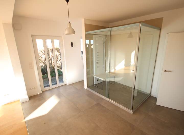 179m² Wohnfläche bietet diese rechte Doppelhaushälfte in bevorzugter Höhenlage von Siegburg Kaldauen. Das Erdgeschoss umfasst am Eingangsbereich das obligatorische Gäste-WC und ein fluroffenes Treppenhaus. Der Grundriss sieht zudem ein sehr großzügiges Wohn-Esszimmer mit Panoramabalkon und den halboffenem Zugang zur hochwertigen (Einbau-)Küche vor. Im giebelhochoffenen Obergeschoss gibt es Zwei Schlafzimmer—eines mit begehbarem Kleiderschrank und Balkon - sowie ein Vollbad mit Fenster, Wanne und Dusche. Im Untergeschoss stehen neben üblichen Keller-Nutzflächen ein weiteres, sehr üppiges Gartenzimmer mit separatem Außenzugang, Panoramafenstern und Zugang zur Terrasse zu Verfügung. Dort ist die große Dampfsauna untergebracht. Das Haus ist technisch äußerst üppig und mit hochwertigen Bodenbelägen (Parkett & Fliesen) ausgestattet. Der pflegeleichte Garten umfasst durch die Hanglage Außensitzplätze und Terrassenbeete - Rasenmähen fällt aus! Das Grundstück könnte nach Absprache durch den Mieter gepflegt werden, sofern eine kontinuierliche Grünpflege garantiert wird. Anderenfalls werden wiederkehrende Gartenarbeiten mit den Betriebskosten abgerechnet.