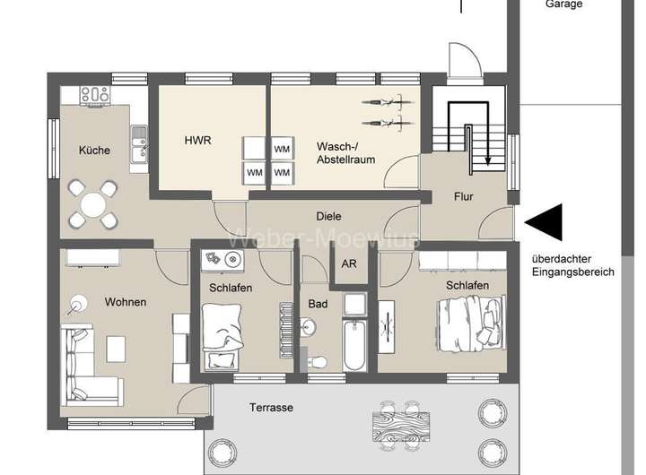 - EG: Abstell-/Waschraum mit weiteren Waschmaschinenanschlüssen und Platz für Fahrräder und Stauraum