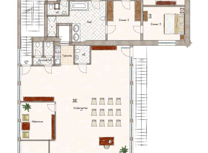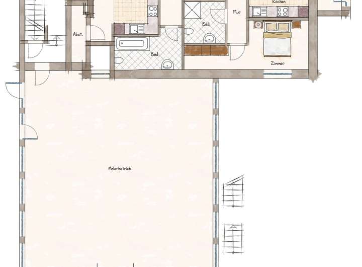 Im hinteren Gebäudetrakt befinden sich 2 langfristig vermietete Gewerbeeinheiten im Erdgeschoss (Malerbetrieb und Polsterei). Das Obergeschoss wird derzeit von einem AWO- Kindergarten genutzt; der Mietvertrag läuft bis voraussichtlich Mitte 2026. Für diese Räumlichkeiten liegt bereits eine Baugenehmigung zum Ausbau und Erweiterung der Etage vor - ein zusätzlicher Vorteil mit weiterem Vermietungspotential.