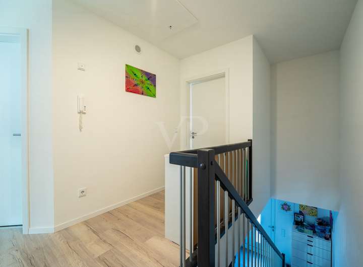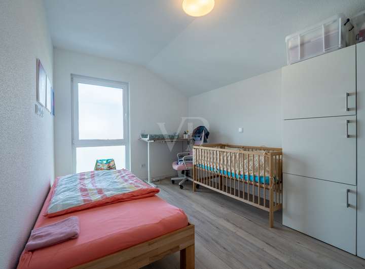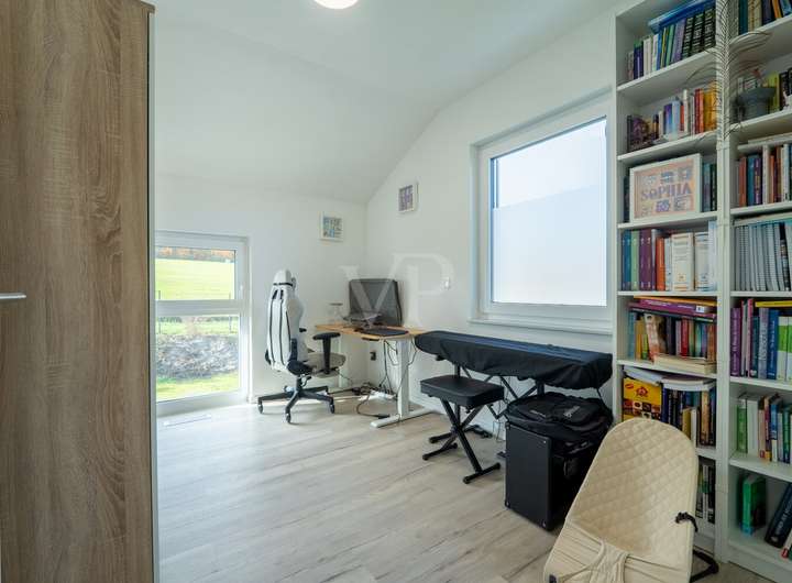 Der Wohnraum im Erdgeschoss ist durch seine vielen Fenster lichtdurchflutet. Eine hochwertige Markeneinbauküche mit Markengeräten ist im Angebot enthalten. Im Hauseingang steht Ihnen ein separates Gäste-WC zur Verfügung. Das Obergeschoss bietet Ihnen drei Schlafräume und ein modernes Tageslichtbadezimmer mit Badewanne und begehbarer Dusche.
