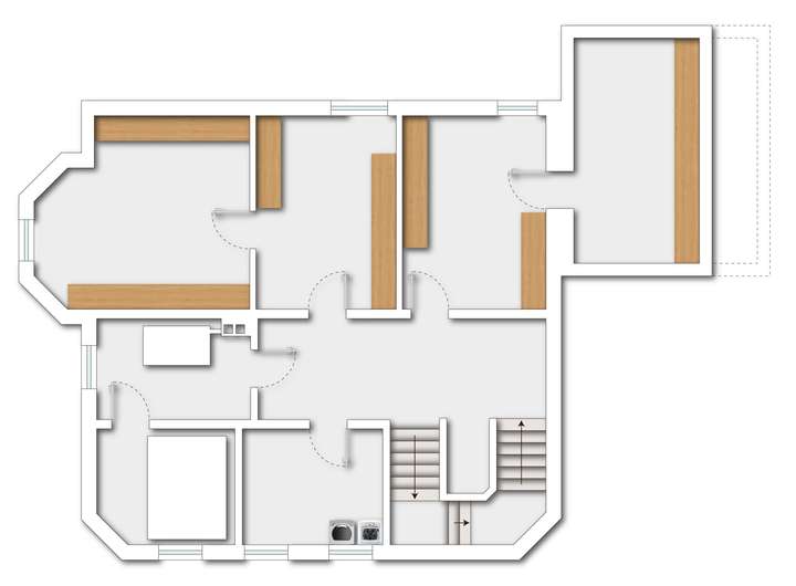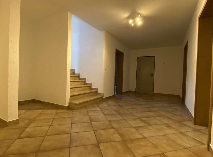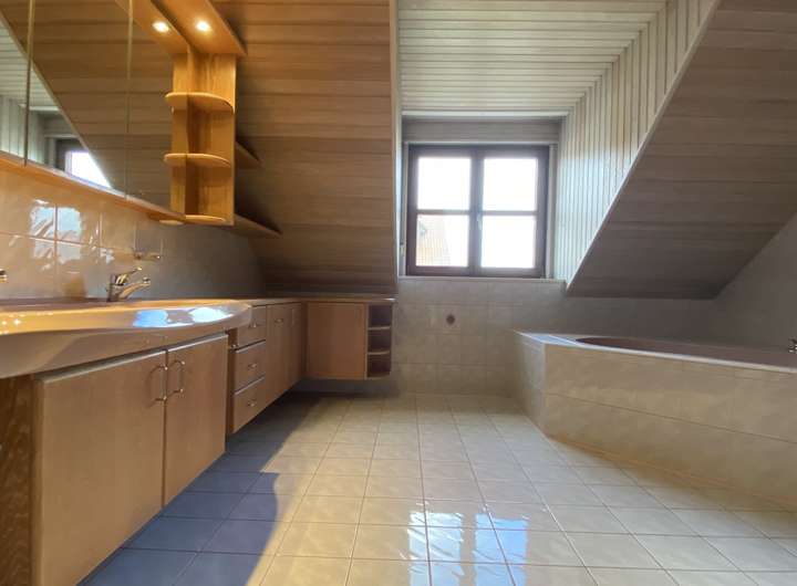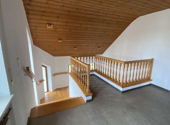 Im Obergeschoss befinden sich das Elternschlafzimmer, zwei Kinderzimmer sowie das modern ausgestattete Badezimmer mit Badewanne. Vom Balkon aus genießen Sie den Blick ins Grüne. Der kleine Garten und die sonnige Terrasse bieten ideale Rückzugsorte zum Entspannen oder Spielen.
