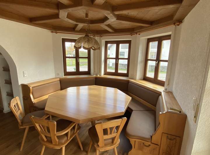 Das Haus besticht durch seinen warmen, einladenden Charakter. Im Erdgeschoss erwartet Sie ein großzügiger Wohn- und Essbereich mit Kachelofen, der in den kühleren Monaten für eine besonders gemütliche Atmosphäre sorgt. Die helle Einbauküche mit integrierter Eckbank lädt zum gemeinsamen Kochen und Verweilen ein.