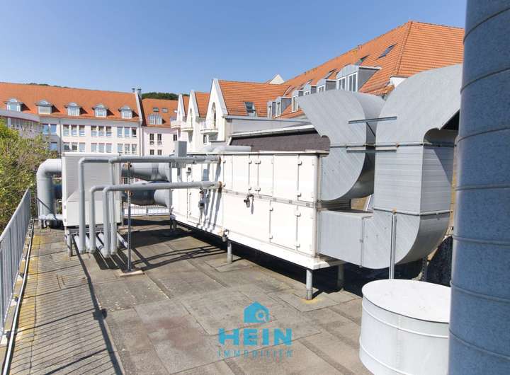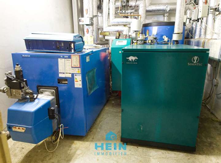 Das Gebäude ist vollunterkellert, verfügt über eine Tiefgarage mit 11 Pkw-Stellplätzen und weist eine solide technische Ausstattung auf: Ein Blockheizkraftwerk (1991) in Kombination mit einer Photovoltaikanlage aus dem Jahr 2015 sorgt für effiziente Energieversorgung. Kunststofffenster aus der Bauzeit sowie eine zentrale Lüftungsanlage sind vorhanden; eine Klimaanlage ist installiert, derzeit jedoch nicht in Betrieb. Die ungedämmten Abstellräume im Dachgeschoss im Altbau können zusätzliche Ausbaureserve bieten.