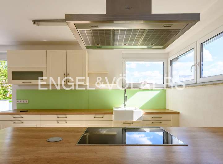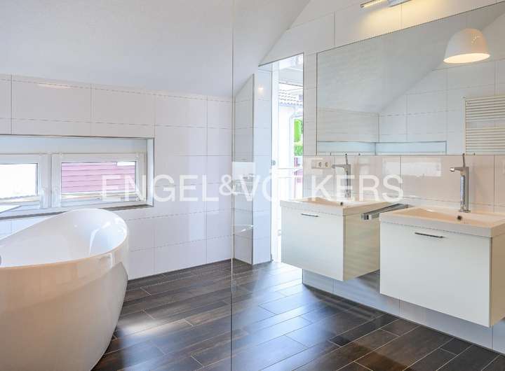 Vom einladenden Eingangsbereich mit großzügiger Garderobe sowie einem separaten Gäste-WC mit Dusche gelangt man über einen kurzen Flur in den weitläufigen Wohn- und Essbereich mit offener Einbauküche. Die moderne Küche, in neuwertigem Zustand, bildet mit hochwertigem Ceranfeld und sämtlichen Einbaugeräten das Herzstück dieses Bereichs – ein Ort, der sowohl zum Kochen als auch zum geselligen Beisammensein einlädt. Für die Einbauküche wird eine monatliche Miete in Höhe von 100 Euro erhoben. Daran anschließend öffnet sich der helle Wohnbereich mit direktem Zugang zum Garten über zwei Ebenen sowie einer Sonnenterrasse, die selbstverständlich mit einer elektrischen Markise ausgestattet ist. Eine weitere, besonders großzügige Terrasse in Südausrichtung rundet das Ensemble auf dieser Ebene ab. Über das elegante Treppenhaus gelangt man in das Obergeschoss. Hier erwarten Sie zwei klug geschnittene Kinder- oder Arbeitszimmer, die durch ein gemeinsames, von beiden Räumen zugängliches Bad verbunden sind. Das großzügige Elternschlafzimmer mit angrenzendem luxuriösem Bad en suite lässt keine Wünsche offen: eine freistehende Badewanne, zwei Waschbecken und eine überdimensionale Dusche schaffen eine private Wellnessoase. Hohe Decken und lichtdurchflutete Räume verleihen dieser Ebene eine besondere Großzügigkeit. Alle Zimmer, einschließlich der Dachflächenfenster, sind mit elektrischen Rollläden ausgestattet. Eine Fußbodenheizung auf sämtlichen Ebenen, betrieben durch eine moderne Luft-Wasser-Wärmepumpe, sorgt für höchsten Wohnkomfort und entspricht zugleich den neuesten energetischen Standards.