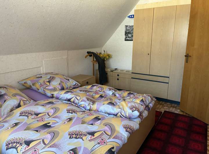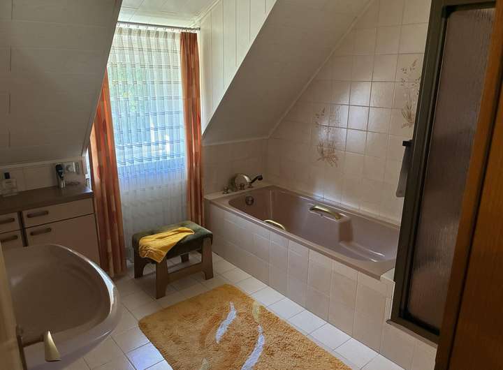 Obergeschoss: (ca. 50 qm) 2 große Schlafzimmer (3 Zimmer möglich), einmal mit Balkon, Badezimmer mit Badewanne und Dusche