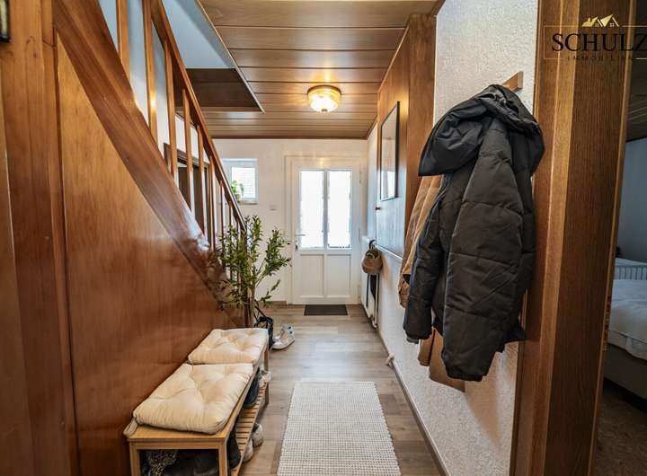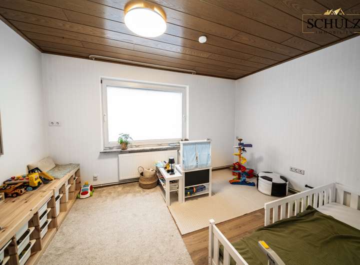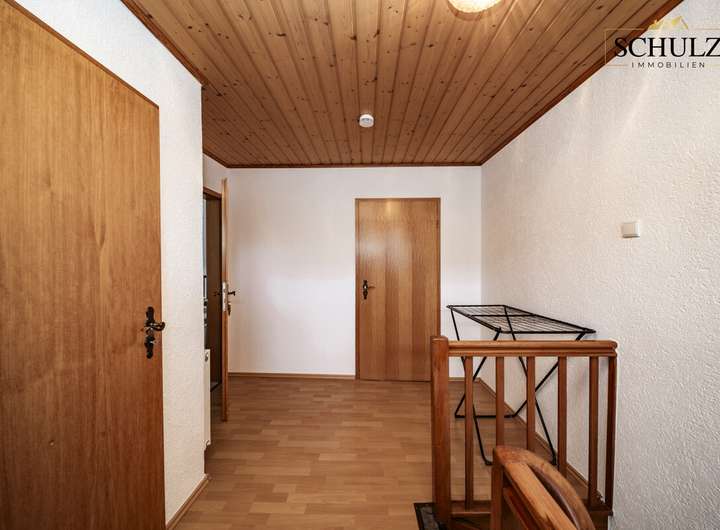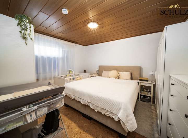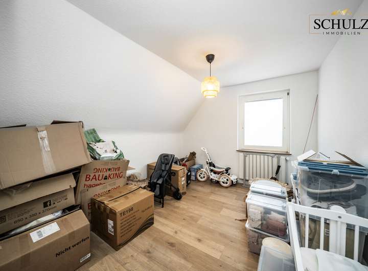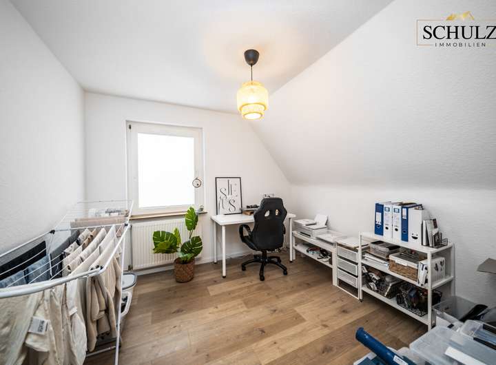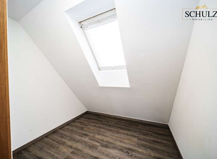 Das Obergeschoss bietet zwei weitere Schlafräume, die individuell genutzt werden können, sowie eine praktische Abstellkammer, die zusätzlichen Stauraum schafft. Die Böden bestehen aus einer Kombination von Kork, Vinyl und Fliesen und schaffen ein angenehmes, modernes Wohnambiente. An den Fenstern sind hochwertige Plissees angebracht, die sowohl Sichtschutz als auch stilvolles Wohngefühl bieten.