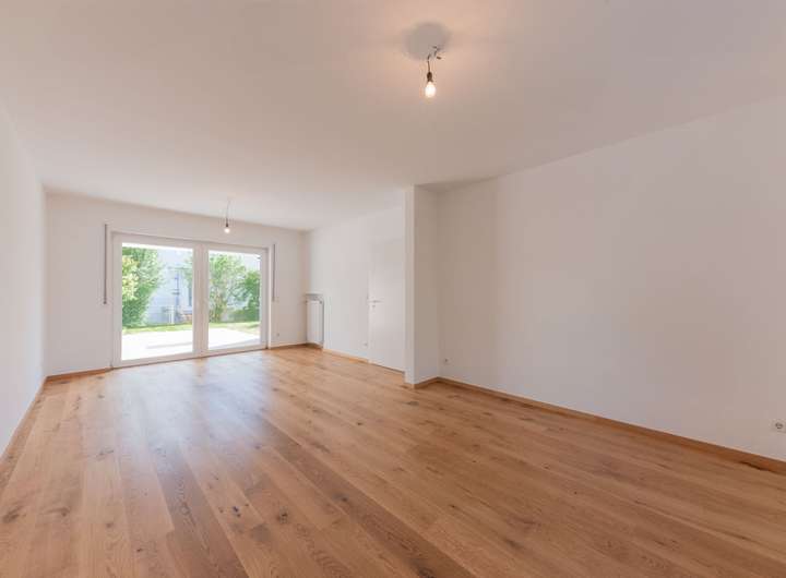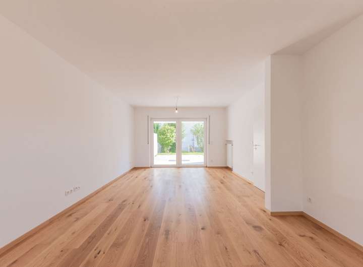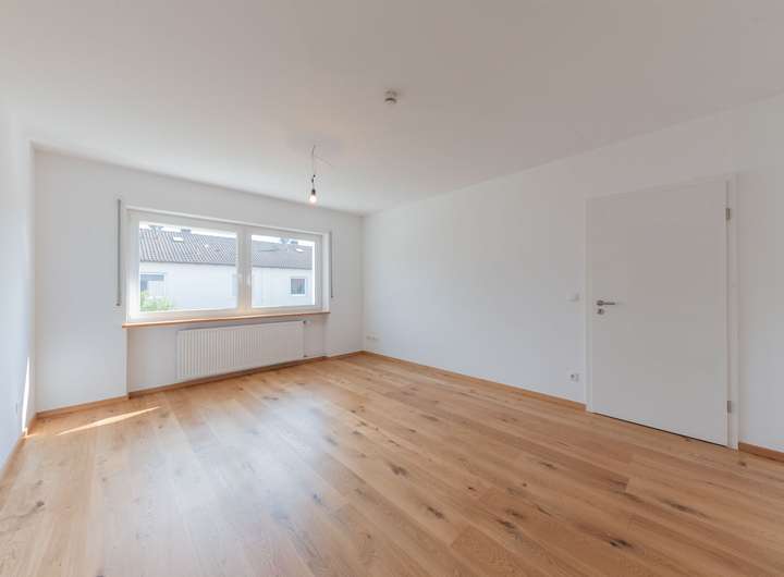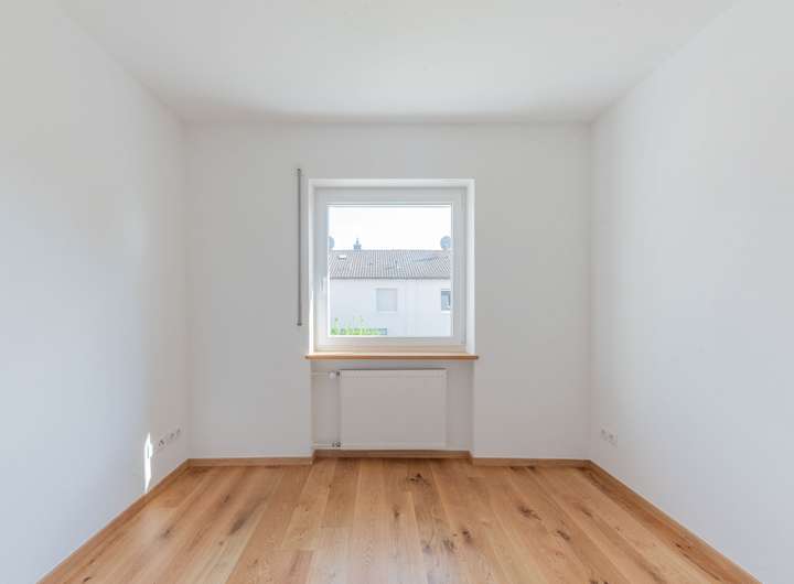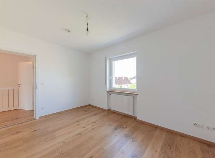Im Erdgeschoss erwarten Sie ein großzügiger Wohn- und Essbereich mit Zugang zur teilüberdachten Süd-Terrasse und dem angrenzenden, privaten Garten, eine separate Küche mit moderner Einbauküche sowie ein stilvolles Duschbad. Das Obergeschoss verfügt über drei Schlafzimmer und ein Tageslichtbad mit Badewanne.