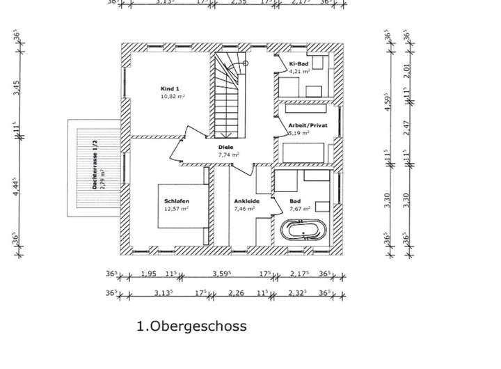 Das auf dem Grundstück zu errichtende Einfamilienhaus kann mit den Maßen 8,74 Meter x 8,74 Meter gebaut werden. Es kann ein Erdgeschoß, ein Obergeschoß und ein Dachgeschoß erstellt werden. Eine Planung mit Ansicht des Hauses, Schnitt, Grundrisse sowie den entsprechen Maßen und Größen erstellen wir.