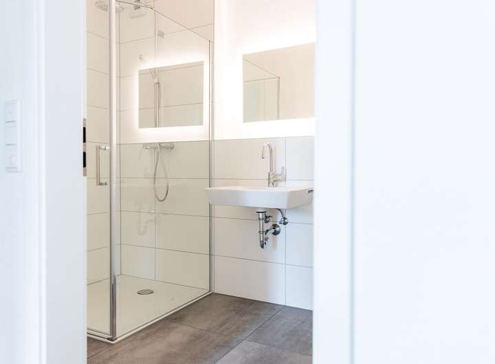 Das modern gestaltete Badezimmer verfügt über eine bodentiefe Dusche mit Glaswänden, sowie einen beleuchteten Spiegel und einem elektrischen Handtuchheizkörper.