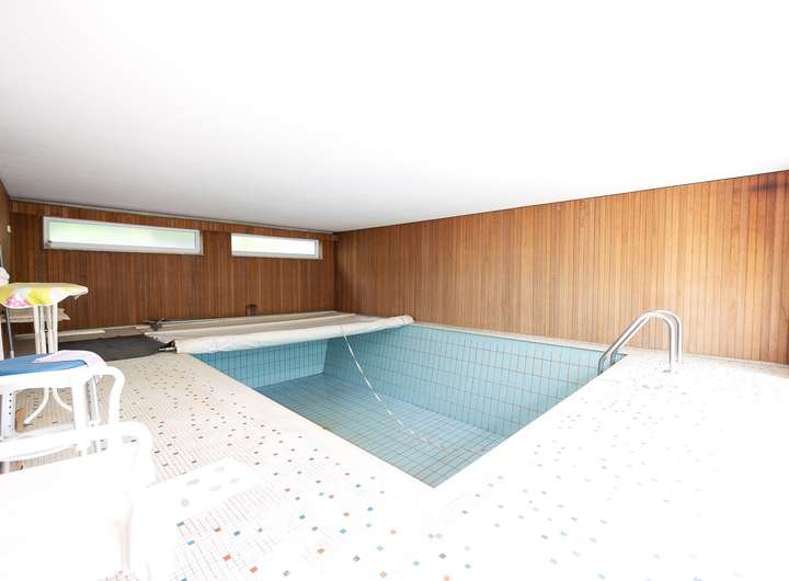 Das Gebäude ist voll unterkellert und bietet im Untergeschoss mehrere funktionale Räume, darunter einen Waschraum, eine integrierte Saunakabine sowie einen großzügigen Indoor-Pool, der dank seiner Bauweise ganzjährig nutzbar ist. Der Poolbereich öffnet sich über eine Schiebetür und Fensterfront zur Hausseite, was einen direkten Zugang ins Freie und entspannte Stunden nach dem Schwimmen ermöglicht.