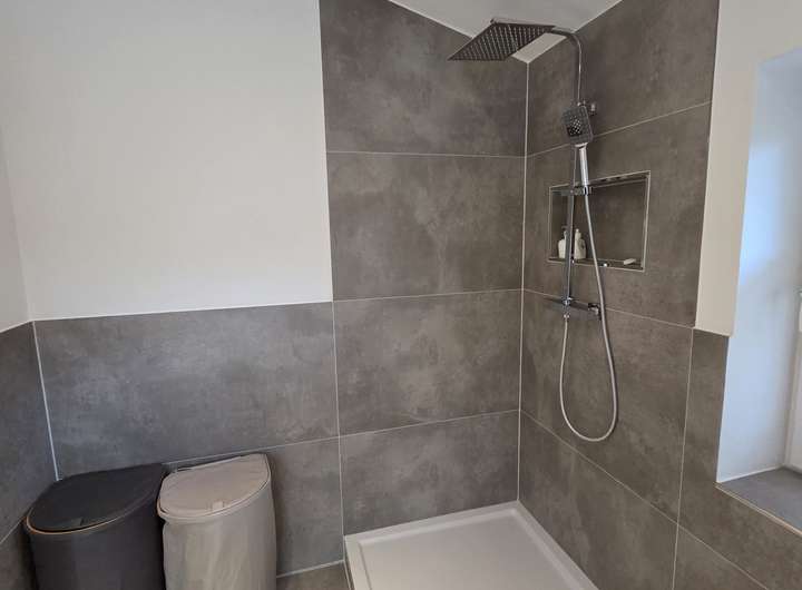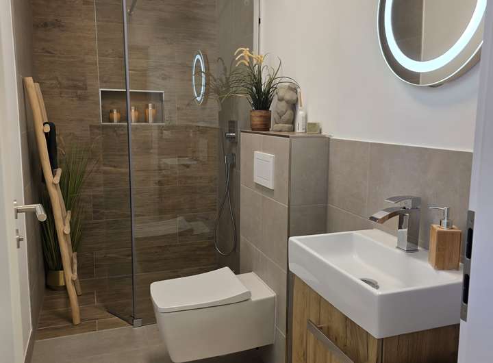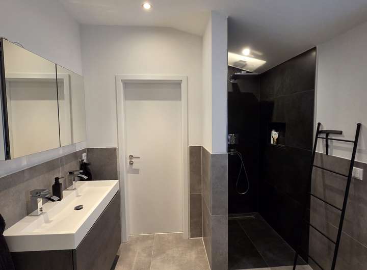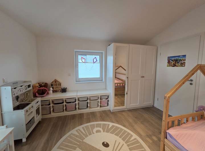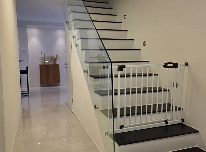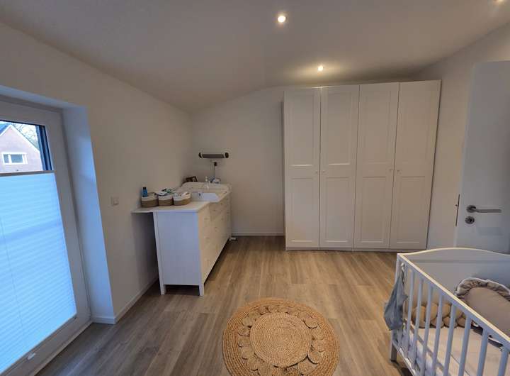 Im Erdgeschoss sind hochwertige Fliesen verlegt, im Obergeschoss Vinylböden.