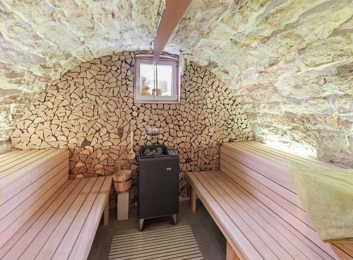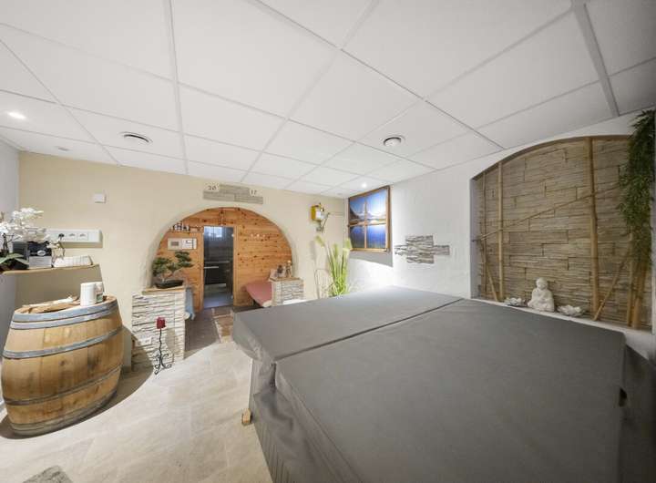 Im Untergeschoss befindet sich ein gemütlicher Partykeller, der regelmäßig für private Veranstaltungen genutzt wird. Ergänzend dazu wurde ein kleiner, ansprechend gestalteter Wellnessbereich mit Sauna und Whirlpool eingerichtet – ideal für die Erholung.