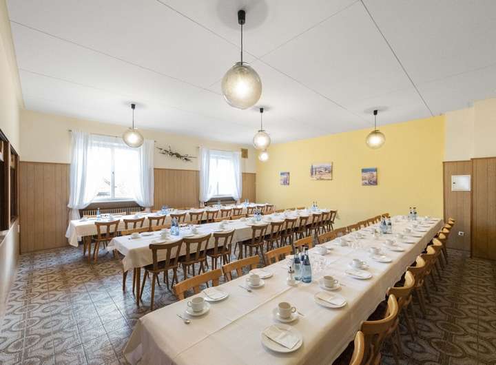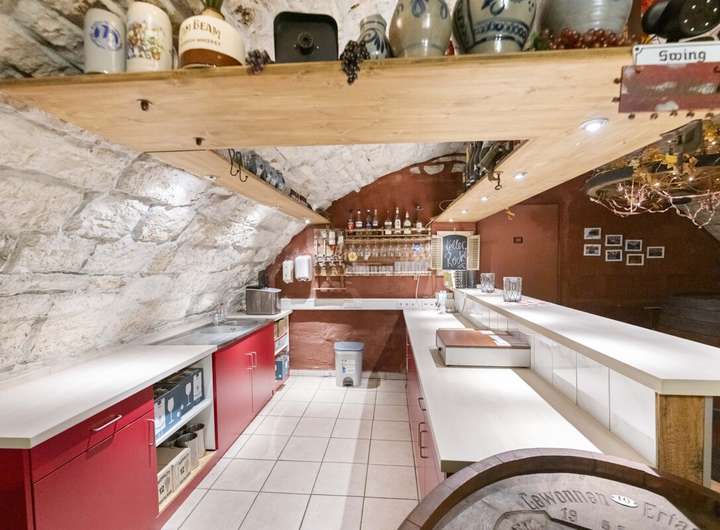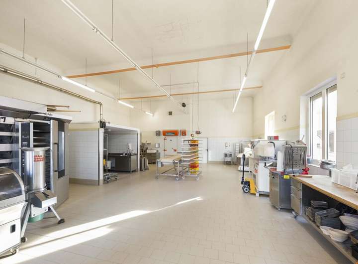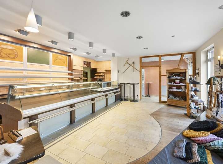 Im Erdgeschoss befindet sich eine ehemalige Bäckerei in sehr gutem Zustand. Die großzügigen Flächen eignen sich ideal für eine gewerbliche Nutzung – etwa für Gastronomie, ein Café, Büroräume oder ein Ladenlokal. Ergänzt wird dieser Bereich durch eine voll ausgestattete Küche mit angrenzendem Sitzsaal, die vielfältige Nutzungsmöglichkeiten eröffnet.