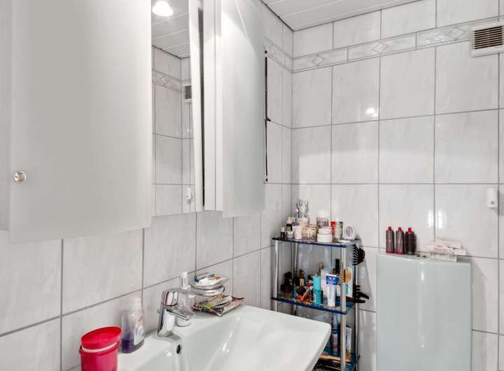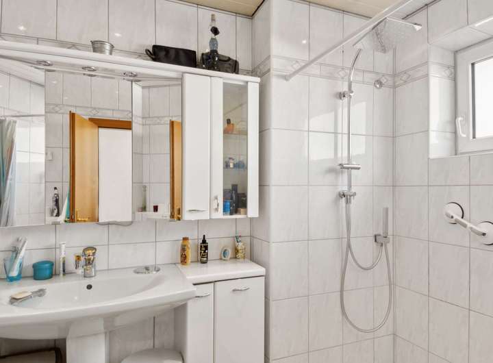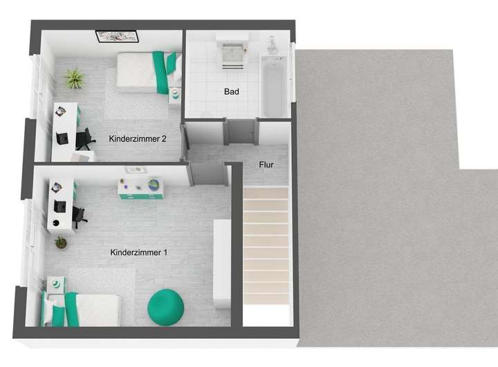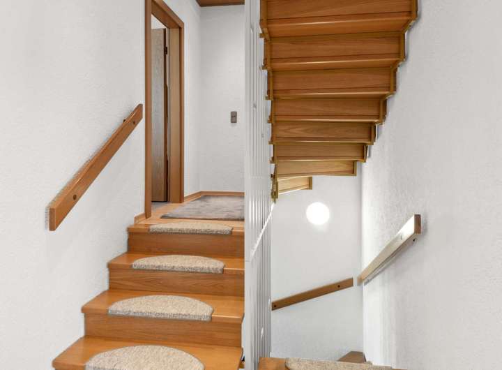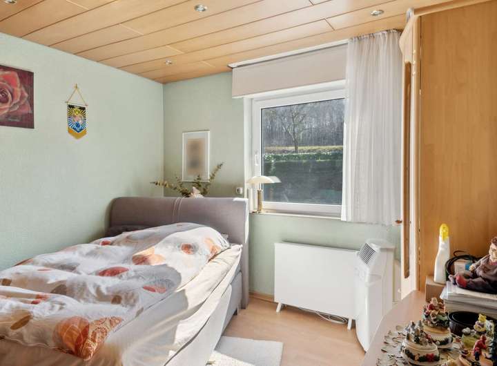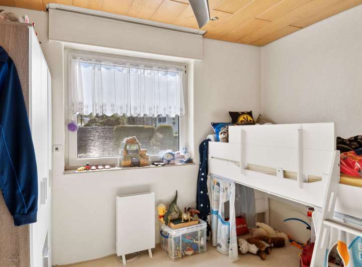 Im oberen Wohnbereich befinden sich das Schlafzimmer, zwei Kinderzimmer sowie das Tageslichtbad. Diese Etage überzeugt durch eine angenehme Raumaufteilung und helle Wohnräume.