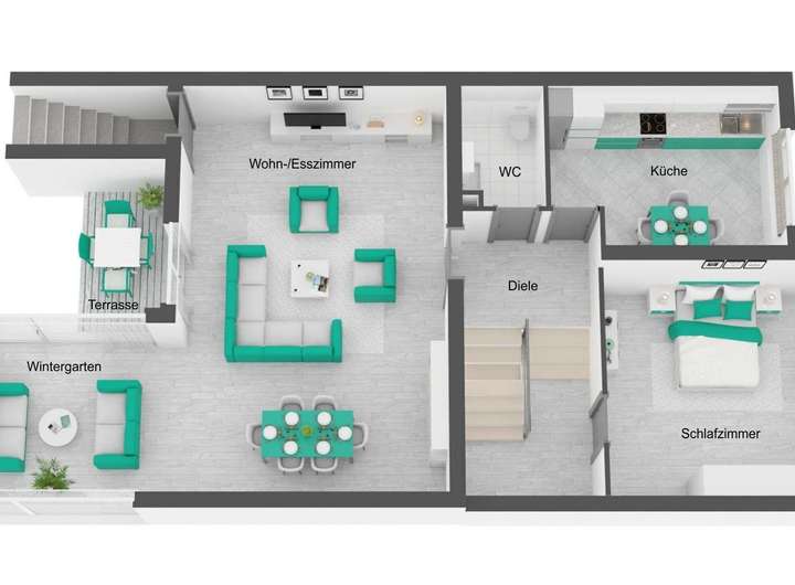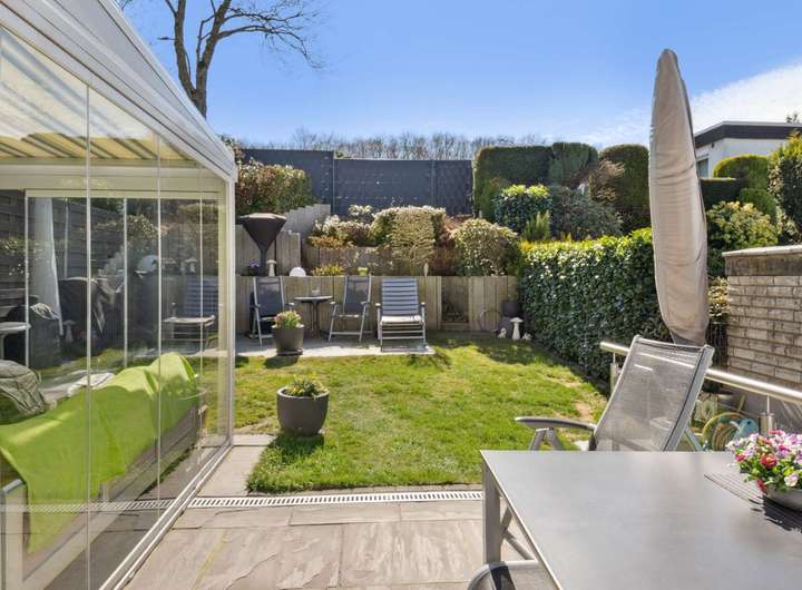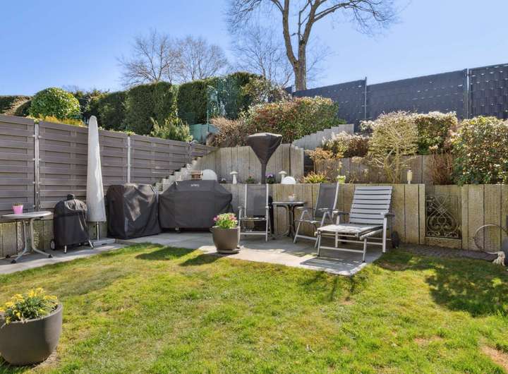Das Erdgeschoss besticht durch ein helles Wohn- und Esszimmer mit Zugang zum Wintergarten und dem liebevoll angelegten Garten – ideal für gemütliche Stunden und gesellige Abende. Ergänzt wird diese Etage durch eine separate Küche und ein Gäste-WC.