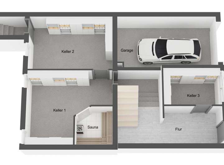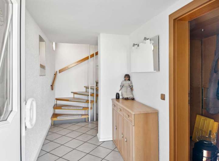 Im Untergeschoss befinden sich der großzügige Eingangsbereich mit Garderobe, ein Hauswirtschaftsraum sowie ein zusätzlicher Kellerraum mit vielfältigen Nutzungsmöglichkeiten.