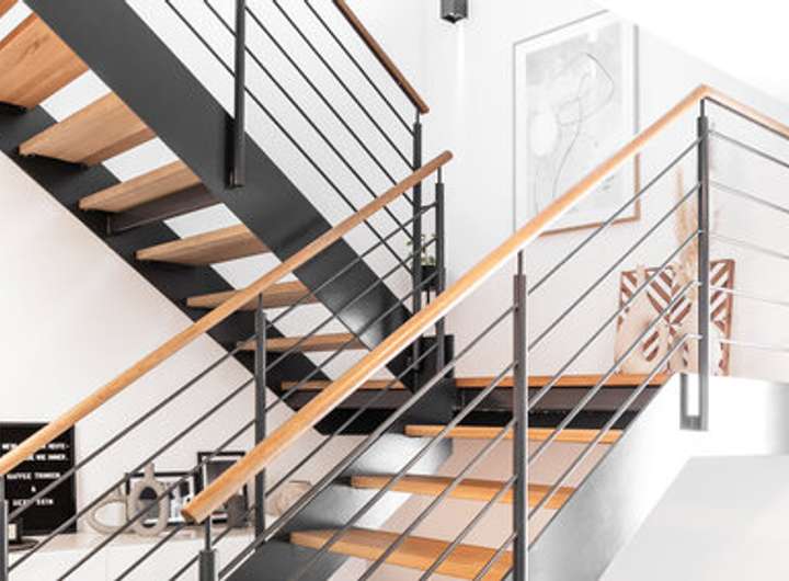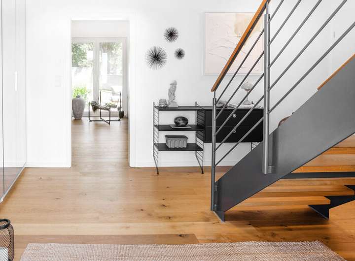 Die moderne, gerade geschnittene Holztreppe verbindet beide Etagen harmonisch.