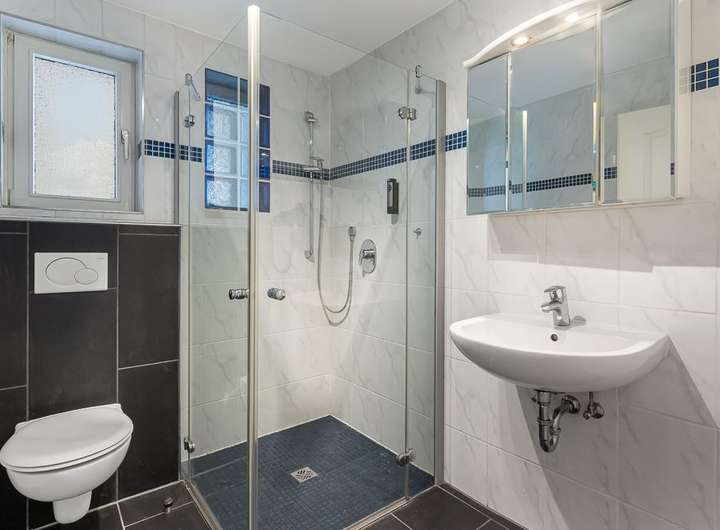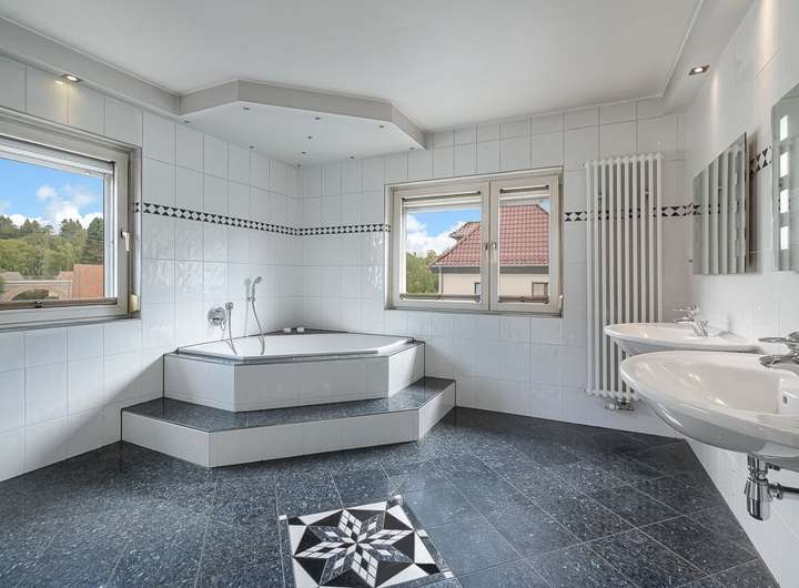 Über den zentralen Flur führt eine Treppe ins Obergeschoss. Dort befinden sich zwei weitere Schlafzimmer und ein Ankleidezimmer. Das Hauptschlafzimmer verfügt über einen direkten Zugang zur großzügigen Dachterrasse mit schönem Blick in den Garten. Das Badezimmer auf dieser Ebene ist als wahre Wellnessoase gestaltet: eine Eckwanne, eine begehbare Dusche zwei Waschbecken sowie ein separater WC-Bereich prägen den hochwertigen Gesamteindruck. Besondere Akzente setzen der edle Blue Pearl Granit, LED-Spots und mehrere Fenster, die für Helligkeit und eine stilvolle Atmosphäre sorgen.