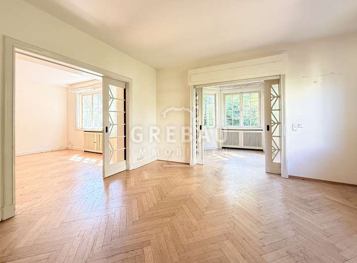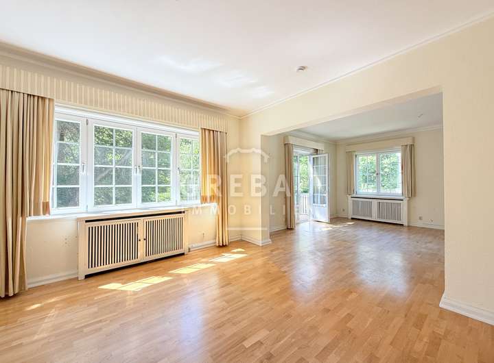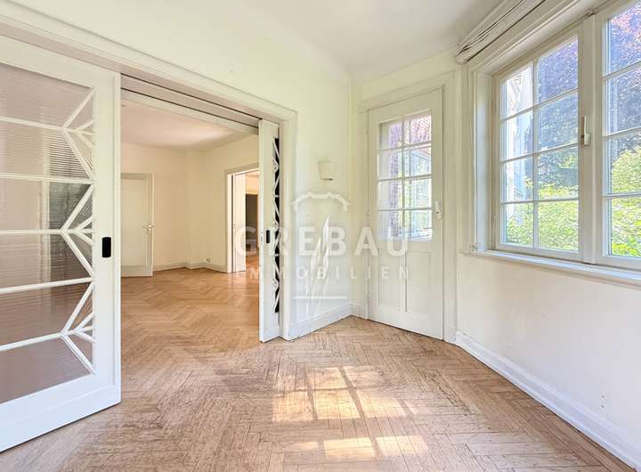 - repräsentative Räumlichkeiten mit großem Eichenfischgrätparkett; Wohn- und Essbereiche sind über große Schiebetüren miteinander verbunden
