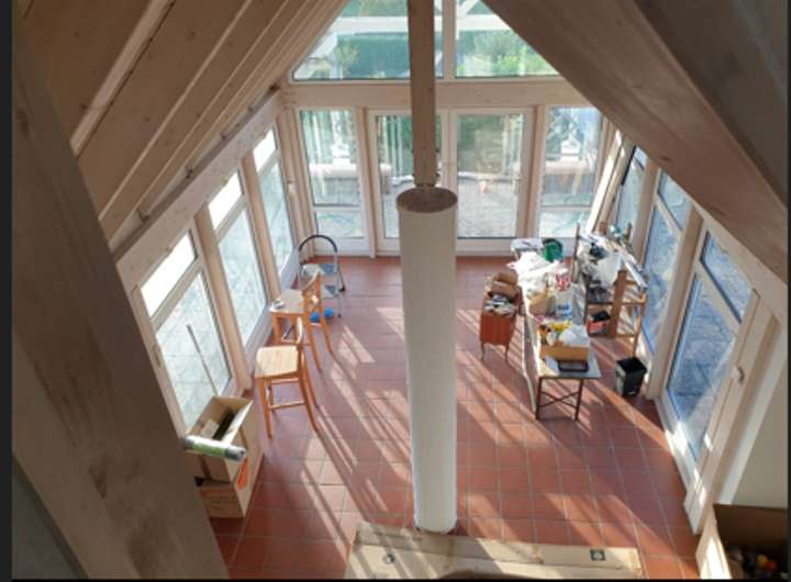 Untergeschoss: großzügiger, klimatisierter Wohnzimmer-Küche-Essbereich mit Wintergarten umfasst von großer Terasse. Schlafzimmer, Gäste-WC, Badezimmer. Flur mit Wendeltreppe, Obergeschoss: 2 Zimmern, 1 Badezimmer.