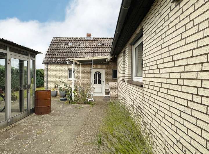 Die große Garage mit Grube bietet neben Stellfläche für Ihr Fahrzeug auch Platz für Gartengeräte und beherbergt danebenliegend die Öltanks. Ein Wintergarten lädt dazu ein, die Natur auch bei kühlerem Wetter zu genießen. Hinter dem Haus erwartet Sie eine großzügig gepflasterte Terrasse mit Blick in den weitläufigen Garten – angrenzend an Wiesen und Felder. Für die Bewässerung steht ein Brunnen mit Pumpe zur Verfügung.