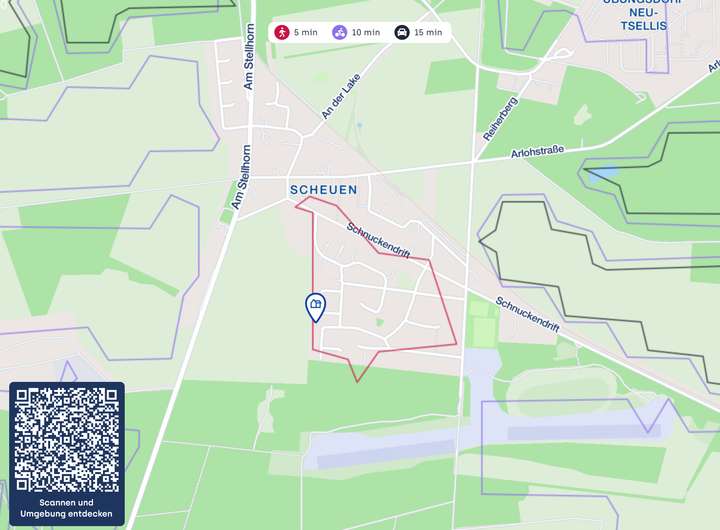 Scheuen - ein charmanter Stadtteil im Norden der Stadt Celle, bietet eine perfekte Mischung aus ländlicher Idylle und städtischer Nähe. Eingebettet in eine grüne Umgebung, ist Scheuen ideal für Naturliebhaber und Familien, die eine ruhige Wohnlage schätzen. Die Nähe zu den angrenzenden Stadtteilen Groß Hehlen und Garßen ermöglicht eine gute Anbindung an das Stadtzentrum von Celle, das nur wenige Autominuten entfernt liegt. Die Infrastruktur in Scheuen ist solide. Der Stadtteil bietet eine gute Nahversorgung mit Supermärkten, Bäckereien und kleinen Geschäften. Für Familien sind die nahegelegenen Schulen und Kindergärten ein großer Vorteil. Zudem gibt es in der Umgebung zahlreiche Freizeitmöglichkeiten, darunter Wander- und Radwege, die durch die malerische Landschaft führen. Ein weiterer Pluspunkt ist die gute Verkehrsanbindung. Die Autobahn A7 ist schnell erreichbar und ermöglicht eine zügige Verbindung nach Hannover und Hamburg. Der öffentliche Nahverkehr ist ebenfalls gut ausgebaut, mit regelmäßigen Busverbindungen ins Zentrum von Celle und darüber hinaus. Der nächstgelegene Flughafen Hannover-Langenhagen ist in etwa 45 Minuten mit dem Auto erreichbar.