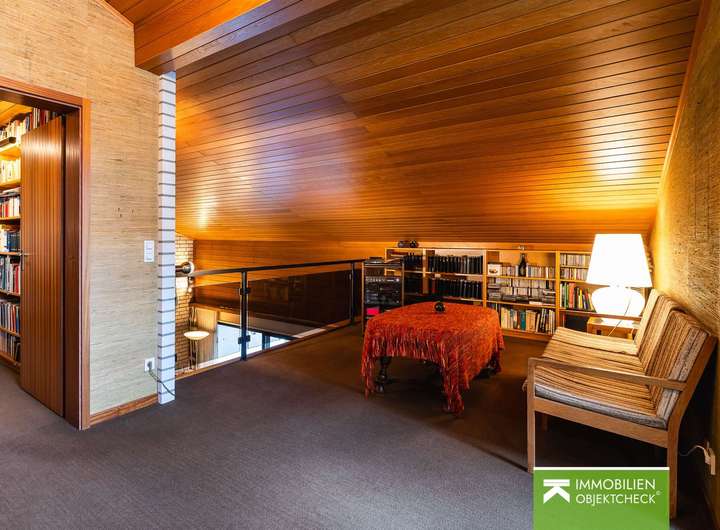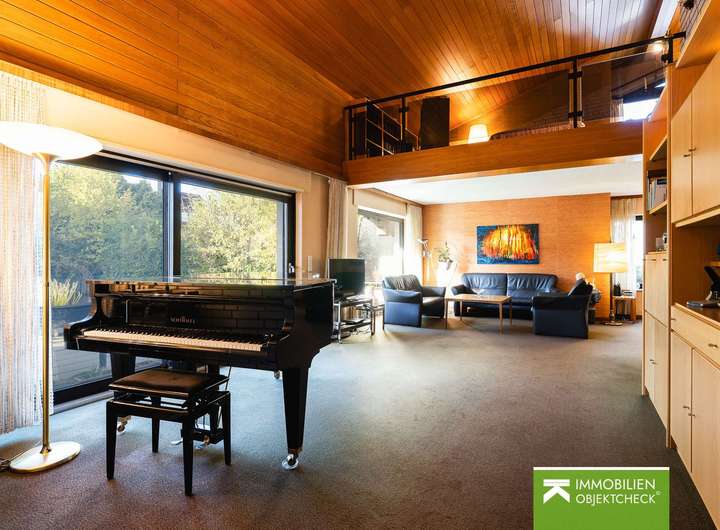 Das Wohnzimmer beeindruckt mit einer großzügigen Galerie und öffnet sich über bodentiefe Fensterfronten direkt zur überdachten Terrasse. Der entstehende offene Luftraum verleiht dem Raum eine besonders ansprechende Wirkung mit einer Raumhöhe von über fünf Metern bis unter den Dachfirst – hell, offen und ein loftartiges Raumgefühl. Zudem besteht die Möglichkeit, im Wohnzimmer einen Kamin installieren zu lassen.