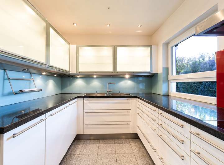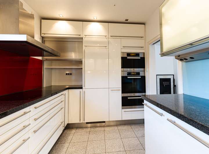 Die durchdachte Einbauküche aus dem Jahr 2014 überzeugt mit weißen Lackfronten, einer eleganten schwarzen Granit-Arbeitsplatte und innovativen elektrischen Miele-Geräten aus den Jahren 2023 und 2024. Sie bietet Induktionsherd, Geschirrspülmaschine, Kühl-Gefrierkombi, Dampfgarer, Geschirrwärmer und stilechte, beleuchtete SieMatic-Oberschränke mit Hubtüren.