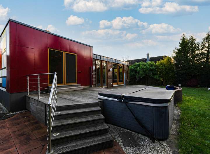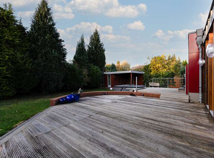 Besondere Highlights sind die vier Terrassen – darunter ein großer Freisitz am geräumigen Gartenhaus mit Strom- und Wasseranschluss –, ein Jacuzzi (mit neuer Abdeckung und Wartung), eine Alarmanlage sowie ein automatisches Einfahrtstor.