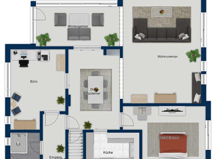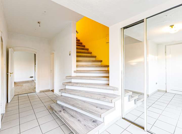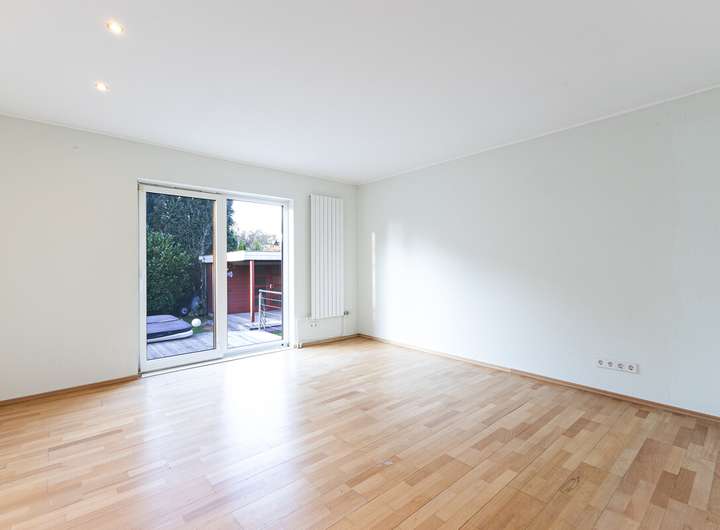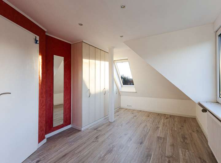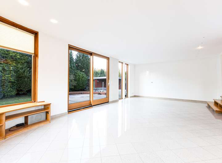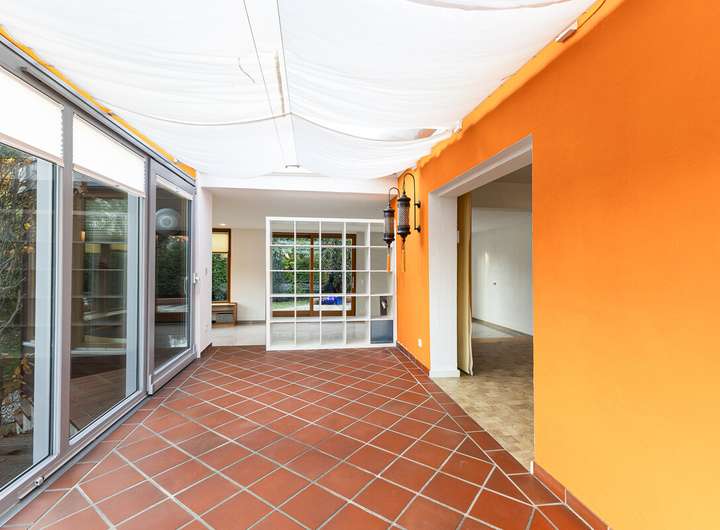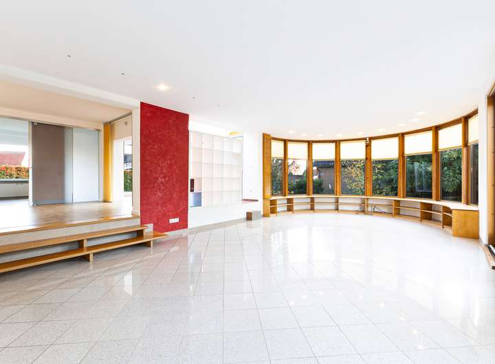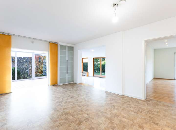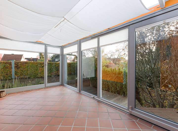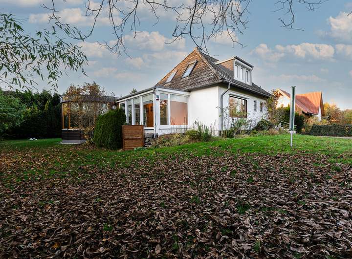Ein beheizbarer und somit ganzjährig nutzbarer Wintergarten mit kleiner Terrasse lädt auf 15 m² zu „Wohnfühlen“ und geselligen Runden ein. Hier sorgt eine Fußbodenheizung für angenehme Temperaturen zu jeder Jahreszeit. Das lichtdurchflutete Wohnzimmer (45 m²) mit architektonischer Halbrundung und bodentiefen Fenster- sowie Schiebetüren, die rundherum angelegt sind, erweitert das Raumgefühl und bietet einen unverstellten Blick in den gepflegten Garten. Dieses herrliche Zimmer sowie eines der Schlafzimmer wurden im Jahr 2002 angebaut und sind nicht unterkellert. Im Obergeschoss befinden sich zwei große Kinderzimmer und ein zeitgemäßes Vollbad, das ca. 2000 modernisiert wurde.