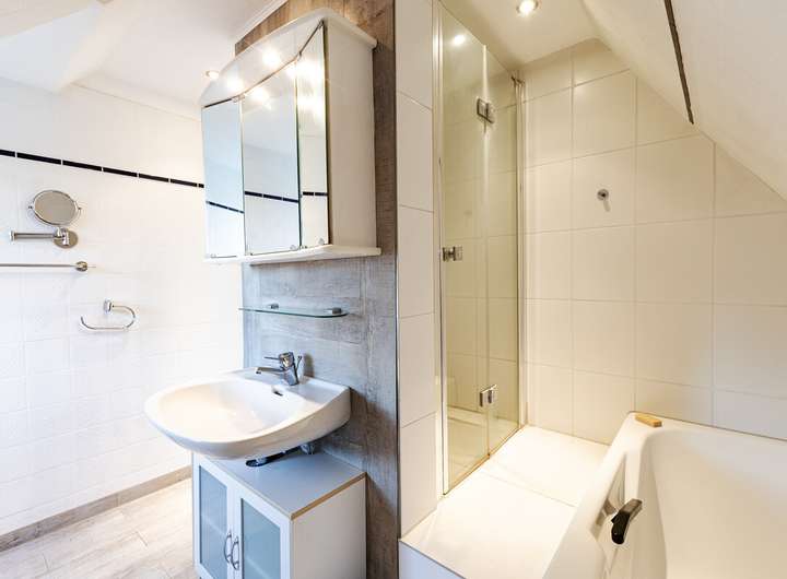 Im Erdgeschoss empfängt Sie ein einladender Eingangsbereich mit praktischem Einbauschrank für die Kleidung. Das Badezimmer wurde 2021 hochwertig erneuert und verfügt über eine ebenerdige Dusche, die modernes Design und Komfort vereint. Mittelpunkt des Hauses ist das großzügige Esszimmer mit 21 m², von dem aus alle Räume abgehen und eine kommunikative Atmosphäre entsteht. Zwei Schlafzimmer mit 19 und 21 m² stehen zur Verfügung, wobei sich eines besonders als ruhiges Arbeitszimmer mit Kachelofen eignet. Der Kachelofen müsste in Bezug auf die aktuellen Emissionsrichtlinien geprüft werden.