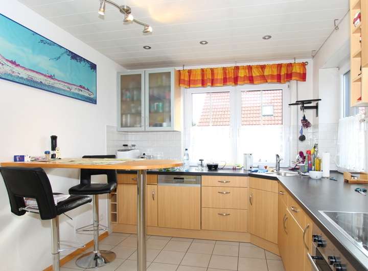 - Küche mit Einbauküche ausgestattet mit Backofen, Ceranfeld, Dunstabzugshaube, Kühlschrank, Spülmaschine und Spüle; diverse Ober- und Unterschränke vorhanden; Fronten aus Holz (braun); Fliesenspiegel (weiß); Fußboden gefliest (creme)