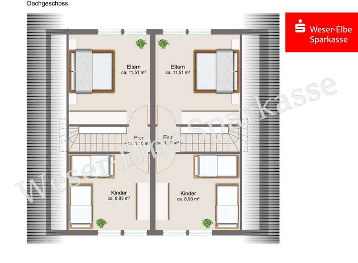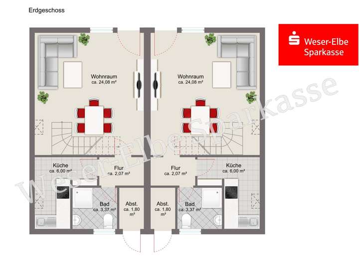 Jede Doppelhaushälfte hat einen identischen Grundriss, und bietet eine durchdachte Raumaufteilung mit allen Annehmlichkeiten einer modernen, zeitgemäßen Ausstattung: Im Erdgeschoß befinden sich in jeder Doppelhaushälfte:
