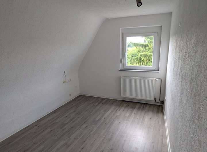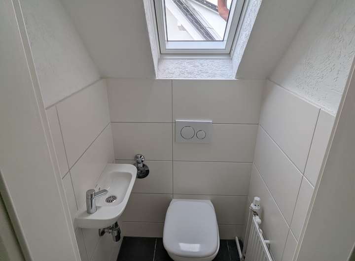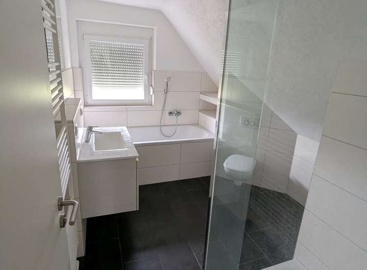 Das modernisierte Badezimmer präsentiert sich in zeitgemäßem Design mit hochwertigen Sanitärelementen. Ein großer Kellerraum sowie ein Dachbodenanteil bieten zusätzlichen Stauraum.