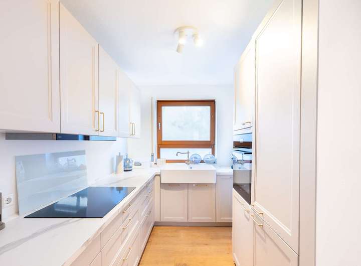 Die hochwertige Maß-Einbauküche, die sich rechts vom Eingangsbereich befindet, lässt keine Wünsche offen und bietet viel Stauraum sowie modernste Geräte – perfekt für alle, die gerne kochen und Wert auf Qualität legen.