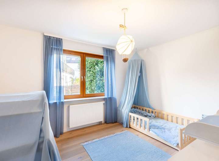 Das zweite Schlafzimmer ist ebenso großzügig geschnitten und eignet sich ideal als Kinder-, Gäste- oder Arbeitszimmer – mit schönem Blick in den Garten.