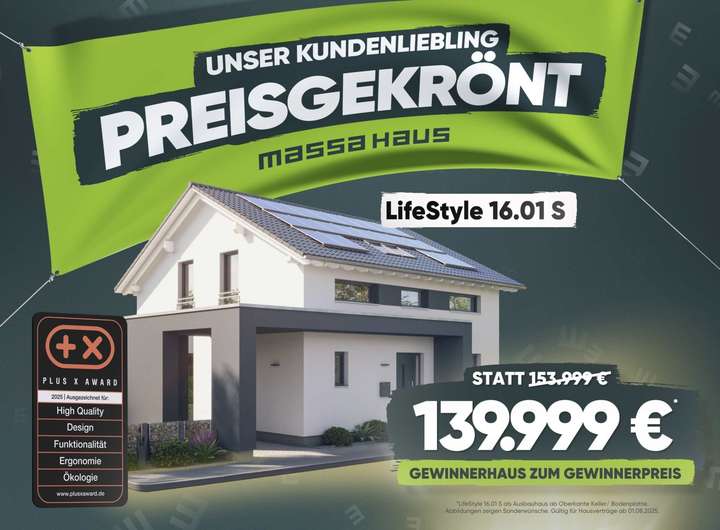 Der genannte Preis versteht sich zuzüglich Bemusterungspaket (komplette Innenausstattung wie z.B. Fliesen, Türen, Sanitärobjekte, Bodenbeläge, usw.), Lohnkosten für den Trocken- und Innenausbau, Baunebenkosten (Erdarbeiten, Hausanschluss, Baustelleneinrichtung usw.), Außenanlage, Grunderwerbsteuer und Notarkosten