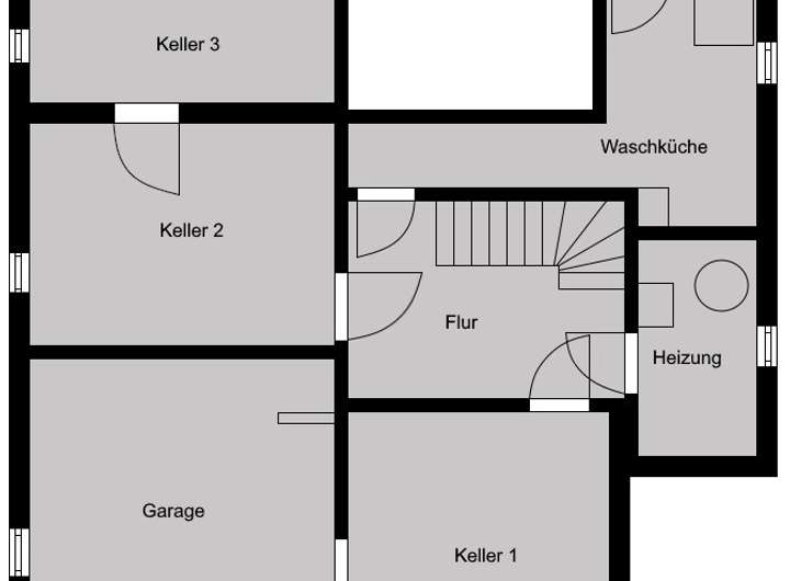 Im Kellergeschoss befinden sich 3 Kellerräume, eine Waschküche mit Dusche, ein Heizraum und ein Flur. Von der Waschküche aus gelangen Sie über eine Außentreppe in den Garten.