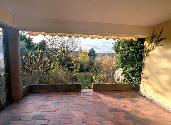 Vom Wohnzimmer aus gelangen Sie auf eine große Terrasse, die zum Verweilen einlädt und direkten Zugang in den großen Garten gewährt.