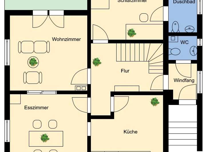 Im EG sind ein Schlafzimmer, ein Flur, eine Küche, ein Duschbad mit Urinal und ein separates WC, vorhanden. Ebenfalls verfügt es über ein Wohn- und ein Esszimmer. Die Räume sind mittels einer Schiebetür miteinander verbunden. Dadurch wird diesen Räumen eine Offenheit verliehen, welche ein großzügiges Raumgefühl und eine behagliche Wohlfühlatmosphäre schafft.